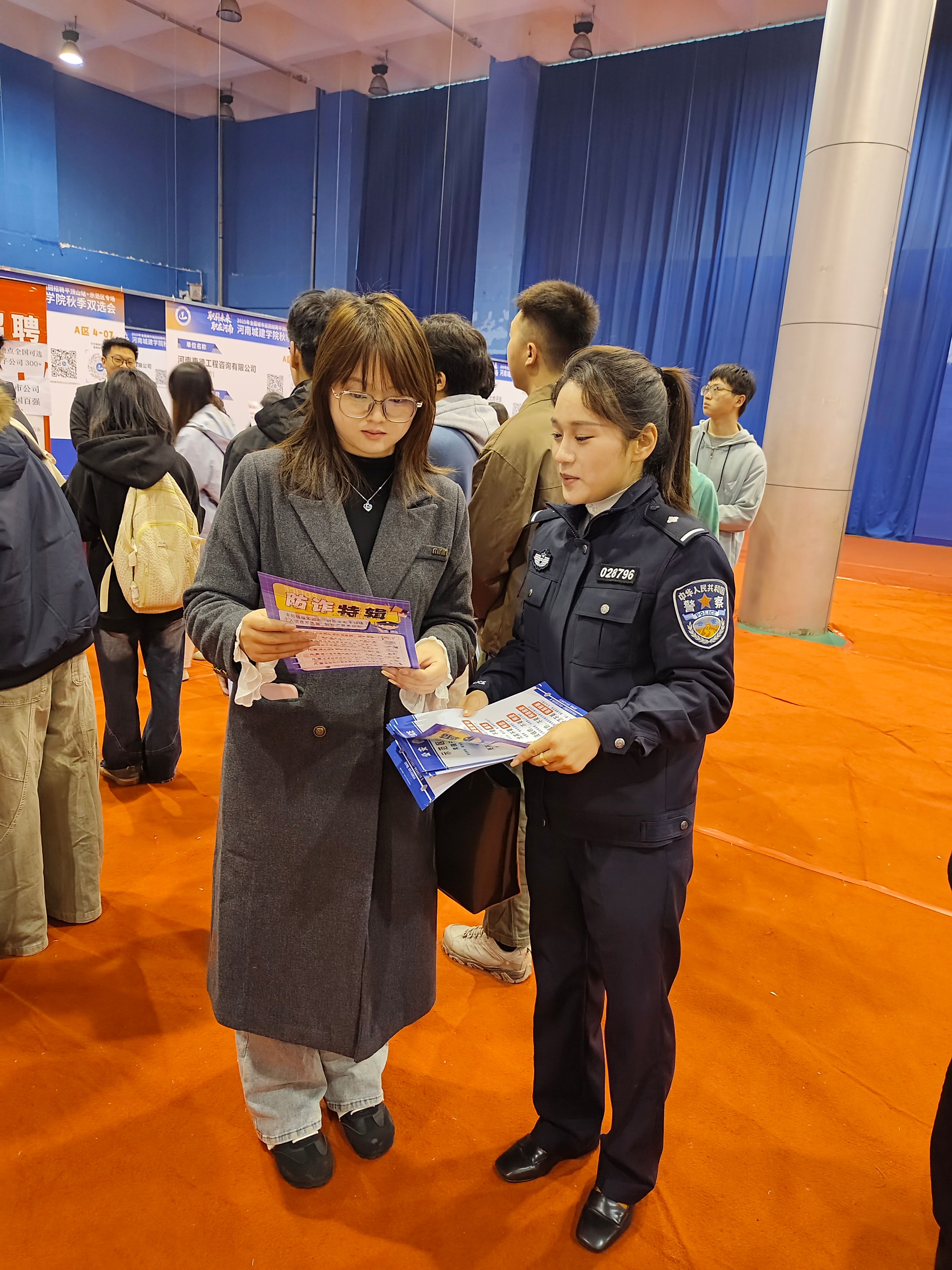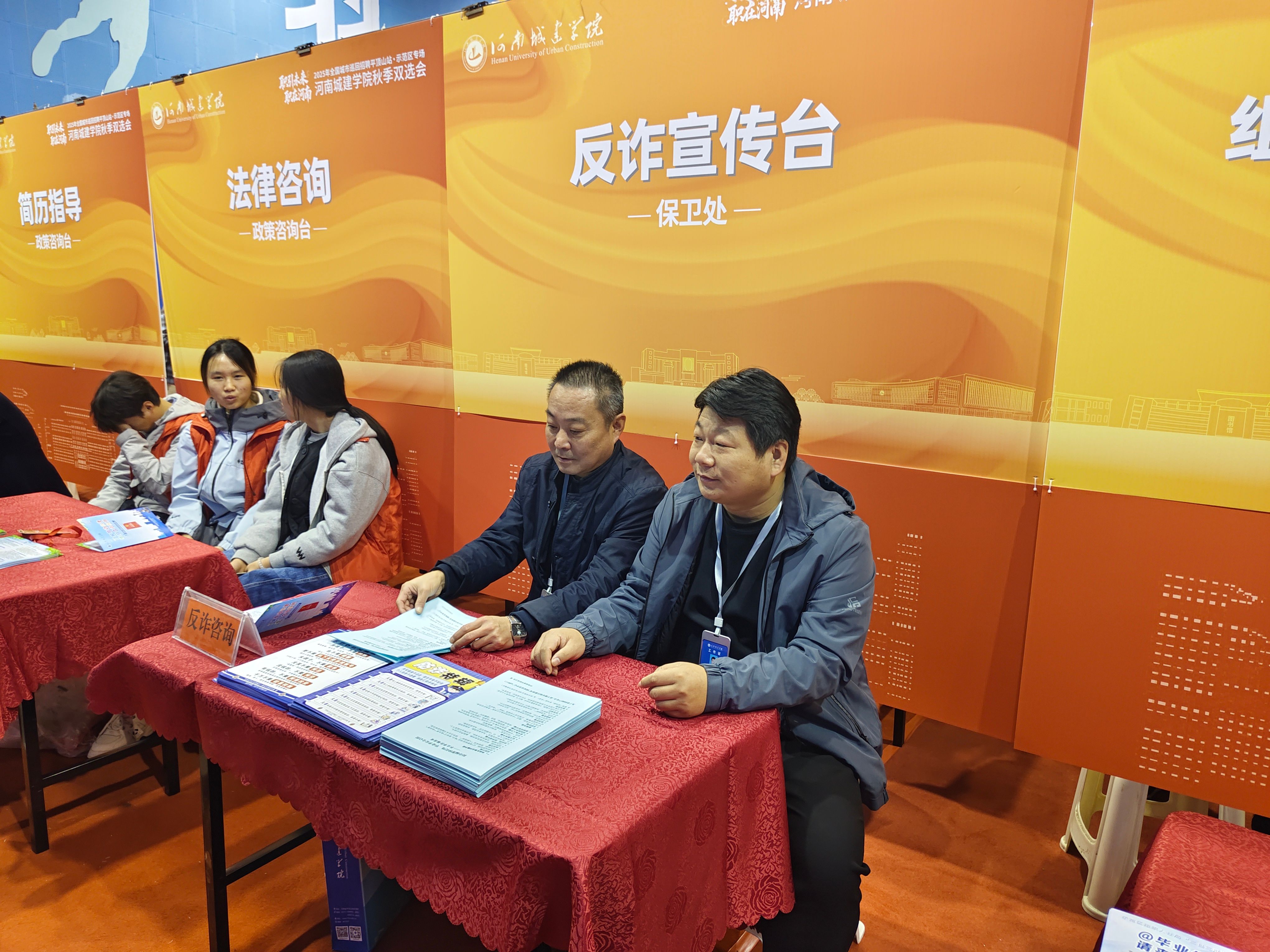 (通讯员 张成哲)为切实提升我校求职学生反诈防诈意识,筑牢校园安全防线,10月24日,保卫处联合湖滨派出所,在学校2026届毕业生秋季双选会现场开展专项反诈宣传活动,为求职学生送上“防骗锦囊”。