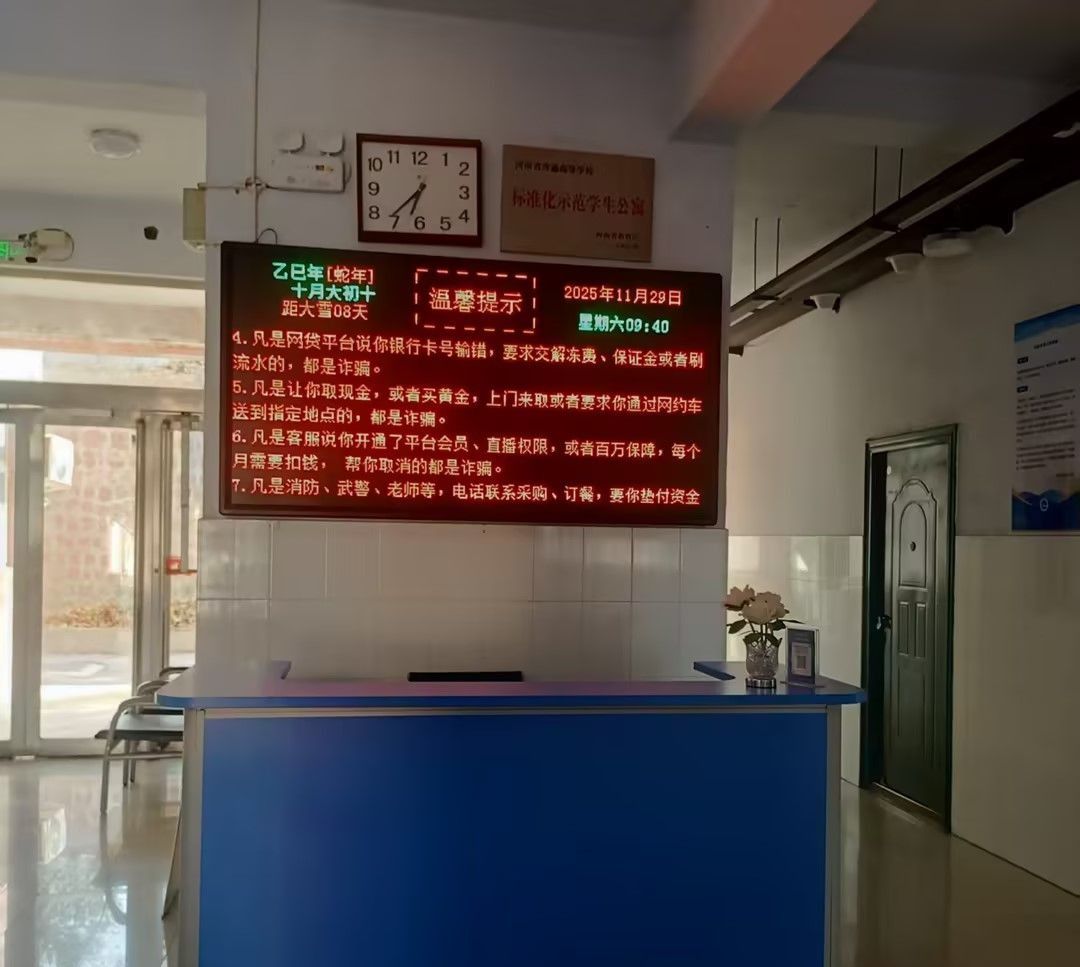 活动期间,联合后勤管理服务中心在餐厅、宿舍等人员密集场所利用电子屏幕滚动播放反诈知识。