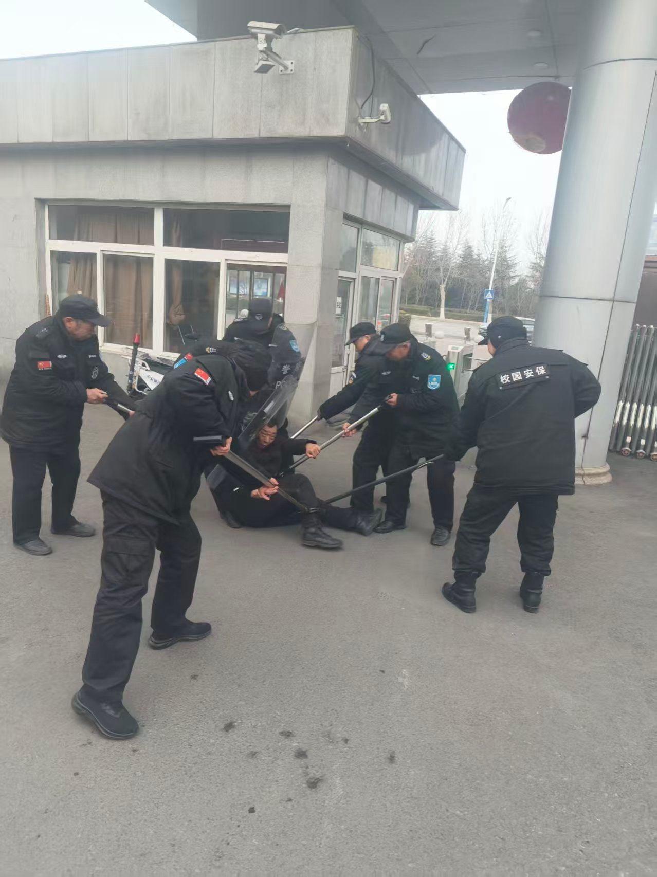 演练现场,安保公司负责人结合校园人流密集、区域分散等安防实际,对防暴盾牌、钢叉、警棍等核心反恐器材的性能参数、适用场景及操作规范进行细致讲解。针对器材使用中的持械站姿、发力角度、协同配合等关键动作,采用“专业示范 + 一对一纠错” 的方式,逐一规范操作要领,引导参训安保人员熟练掌握“一人防护、多人协同、快速处置” 的实战流程,确保在突发情况中能精准运用器材、高效开展处置。并针对外来可疑人员强行闯岗进行了模拟演练。